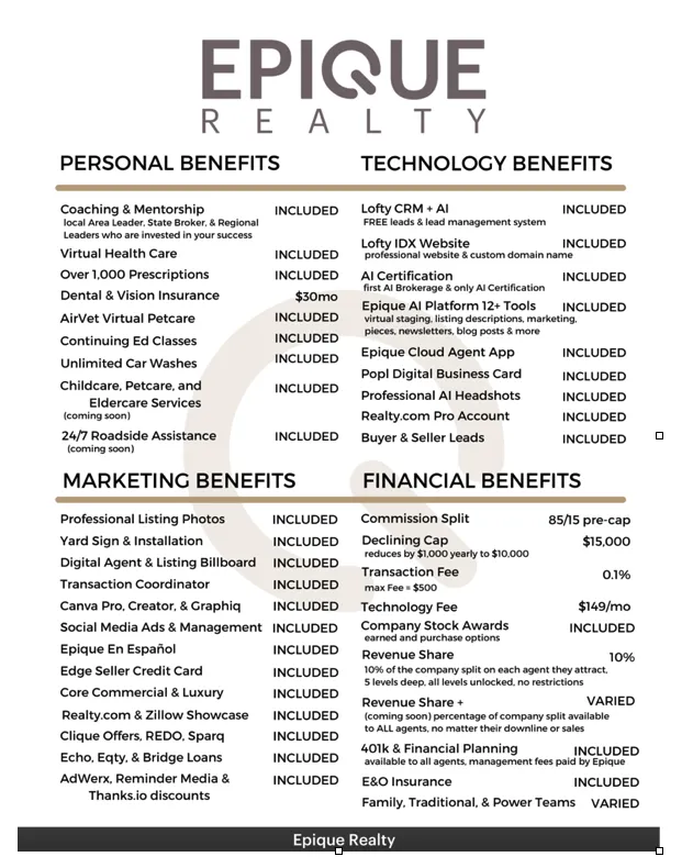 Since I joined Epique, I’ve increased my commission with premium splits and brokerage equity, while getting endless mentorship, pro-level marketing (4K photos, signs, social ads), and local transaction coordination - for free!